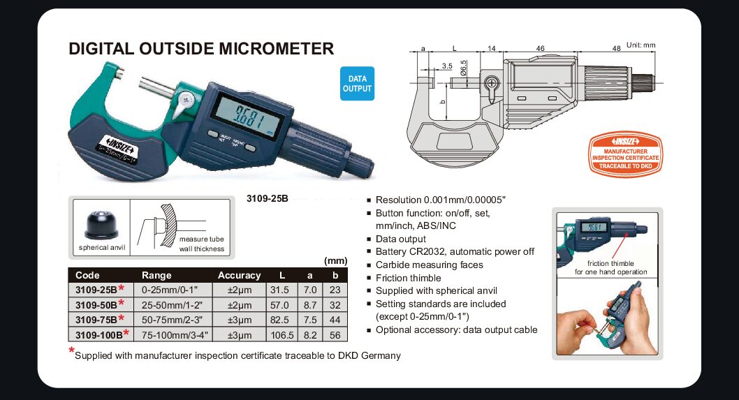 The Insize 3109 digital outside micrometer enables quick and precise measurement. The carbide measuring faces create a durable, ware resistant tool which allows for repeated measurements, and with the aid of a ratchet thimble makes for one handed operation.