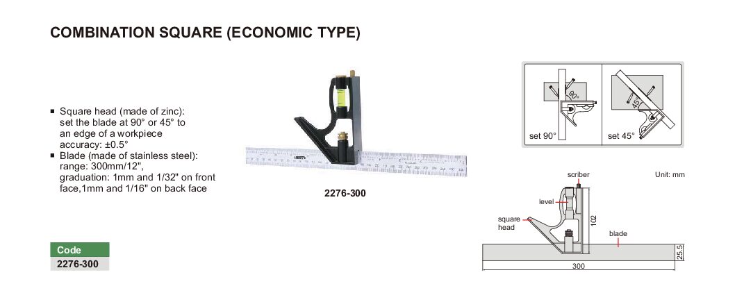 The INSIZE 2276-300 Combination Square Economic Type has the following specifications: